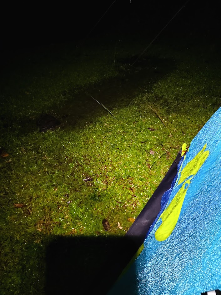 我發覺個帳底有啲涼,摸吓原來下面開始有水!雖然未滲出,但摸落去軟淋淋都幾驚,出外面望吓就明,原來頭頂方向有積水,積水沿一條淺坑流過帳底,我好似紥咗響條小河上面咁: